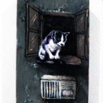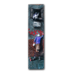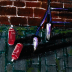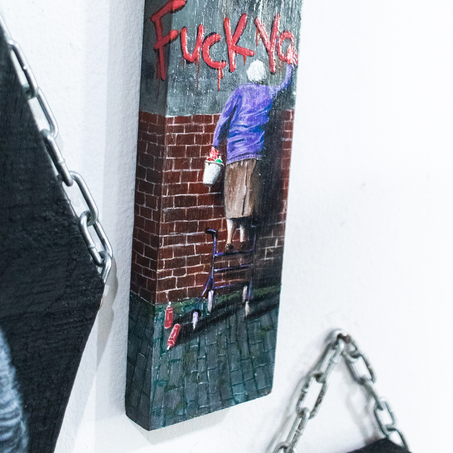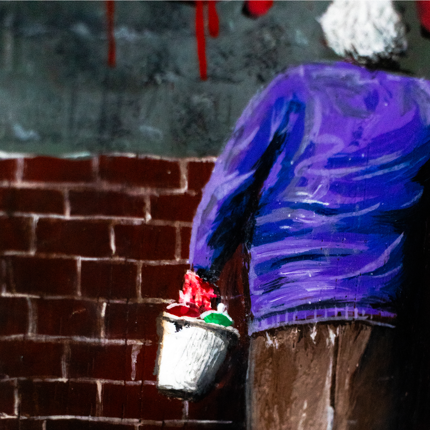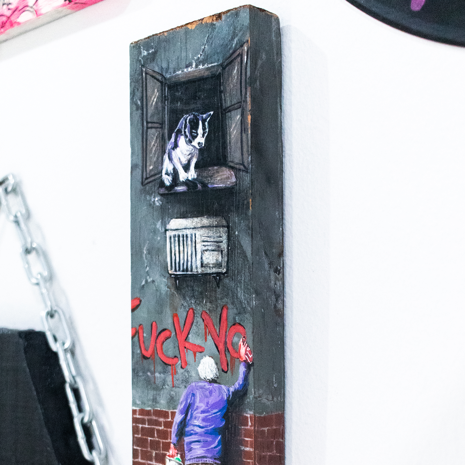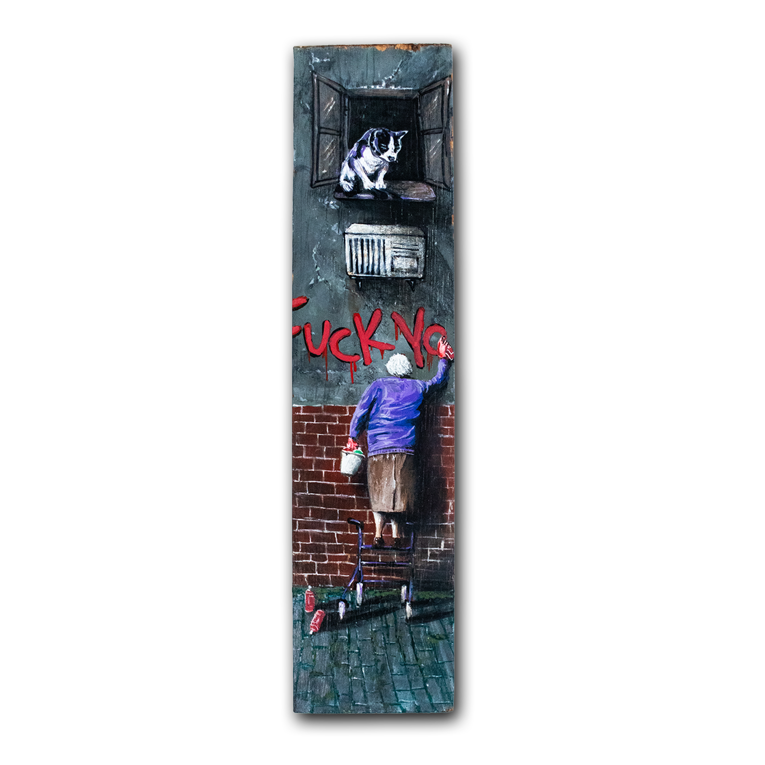 Esta peça, pintada sobre uma placa vertical de madeira, captura a essência da rebeldia que ignora convenções e calendários. Cada elemento da cena foi trabalhado para criar uma atmosfera urbana autêntica: a textura áspera da parede, o rejunte dos tijolos, o brilho úmido do pavimento e até o gato que observa tudo de sua janela, como um espectador silencioso daquela pequena revolução.