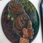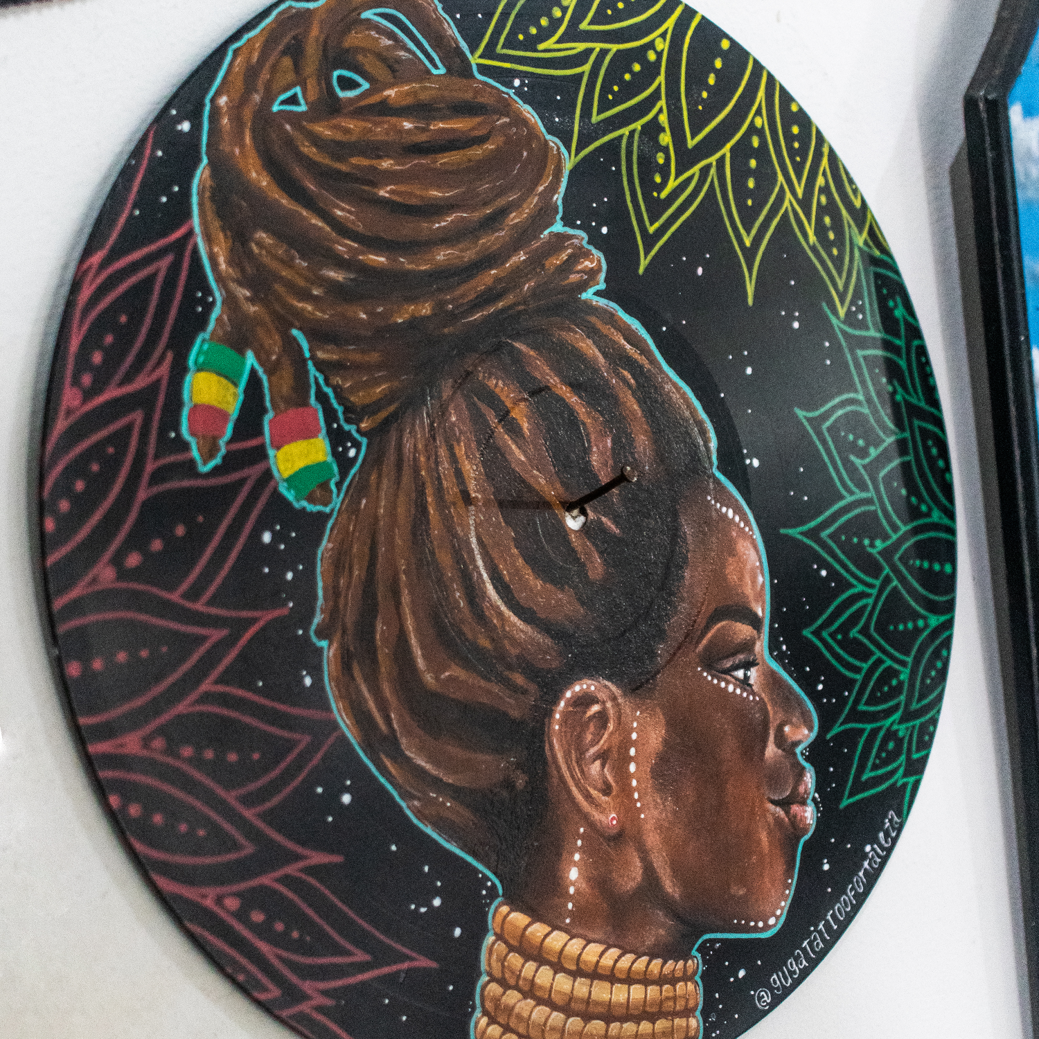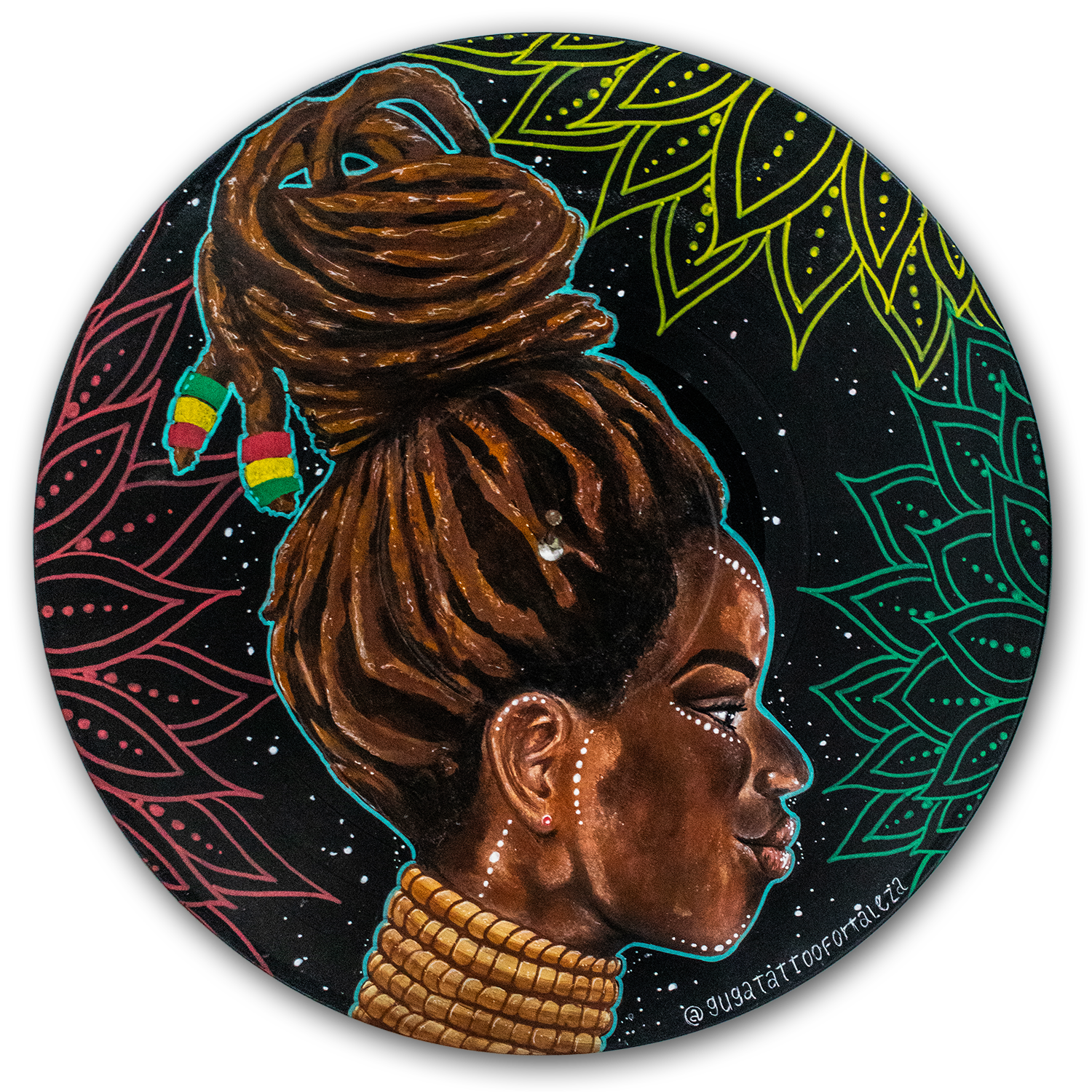 Esta obra de arte foi pintada à mão diretamente sobre um autêntico disco de vinil (LP), usando a plataforma giratória da música como base para uma celebração da cultura. “Frequência Raiz” é um retrato que pulsa com cor e identidade, onde os sulcos do disco se tornam as linhas da vida de uma trilha sonora ancestral.