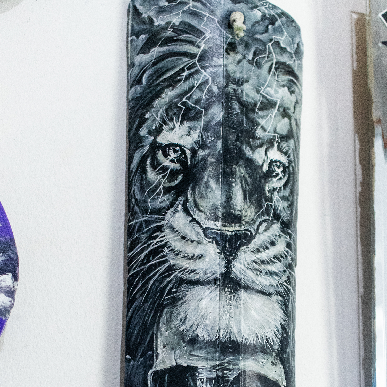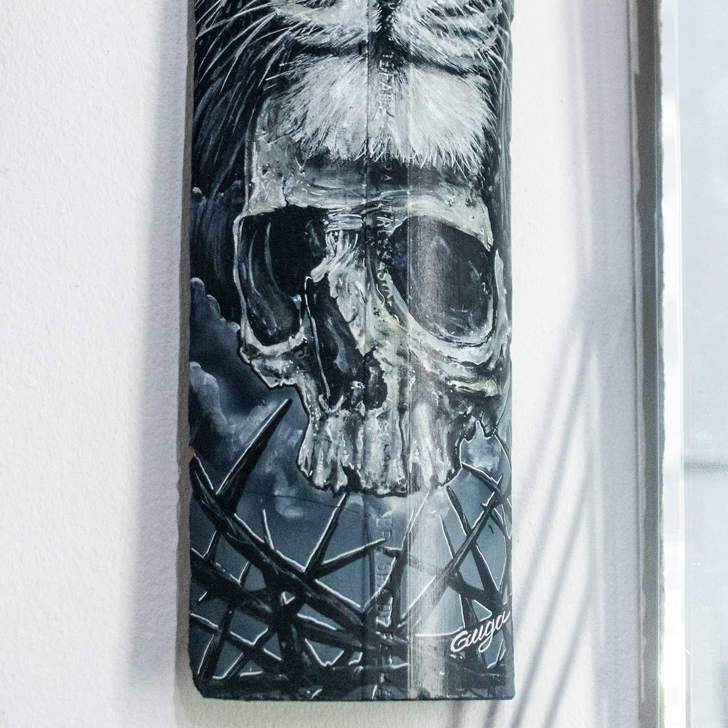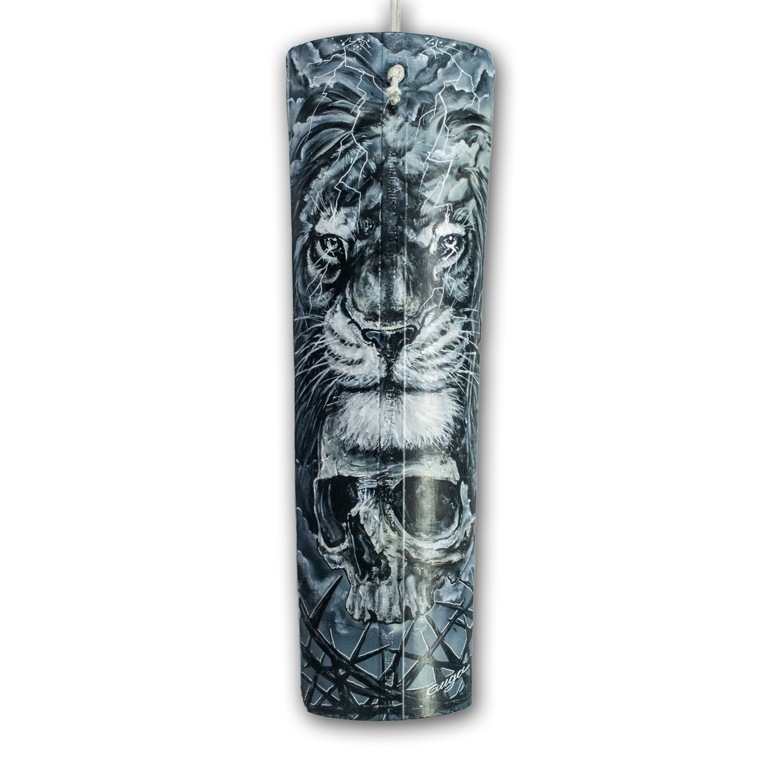 Vela artística de grande porte, pintada à mão. A obra retrata a fusão de um tigre e uma caveira sob uma tempestade, simbolizando a transição entre a força vital e a mortalidade. Uma peça de arte funcional, única e assinada.