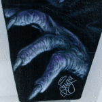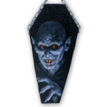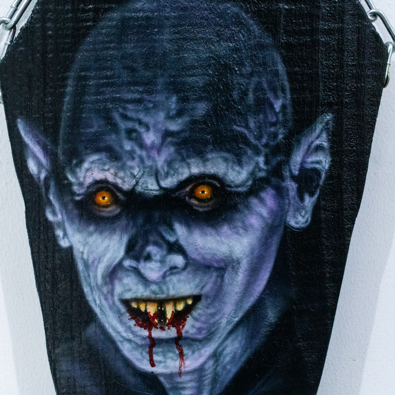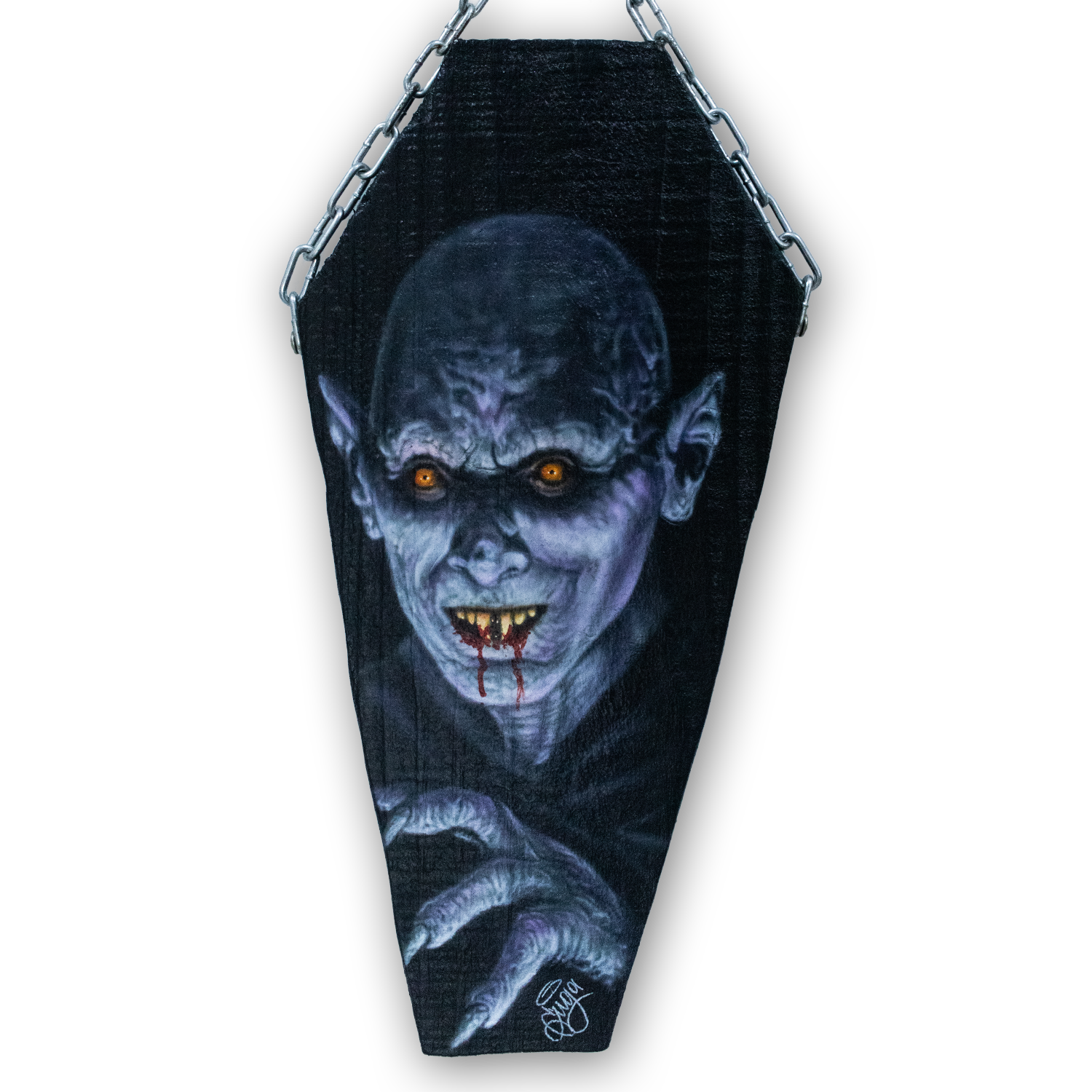 Esta obra é uma homenagem à figura do Nosferatu, o predador que assombra as trevas, pintado diretamente sobre uma base de madeira em formato de caixão que serve como seu eterno refúgio.