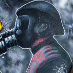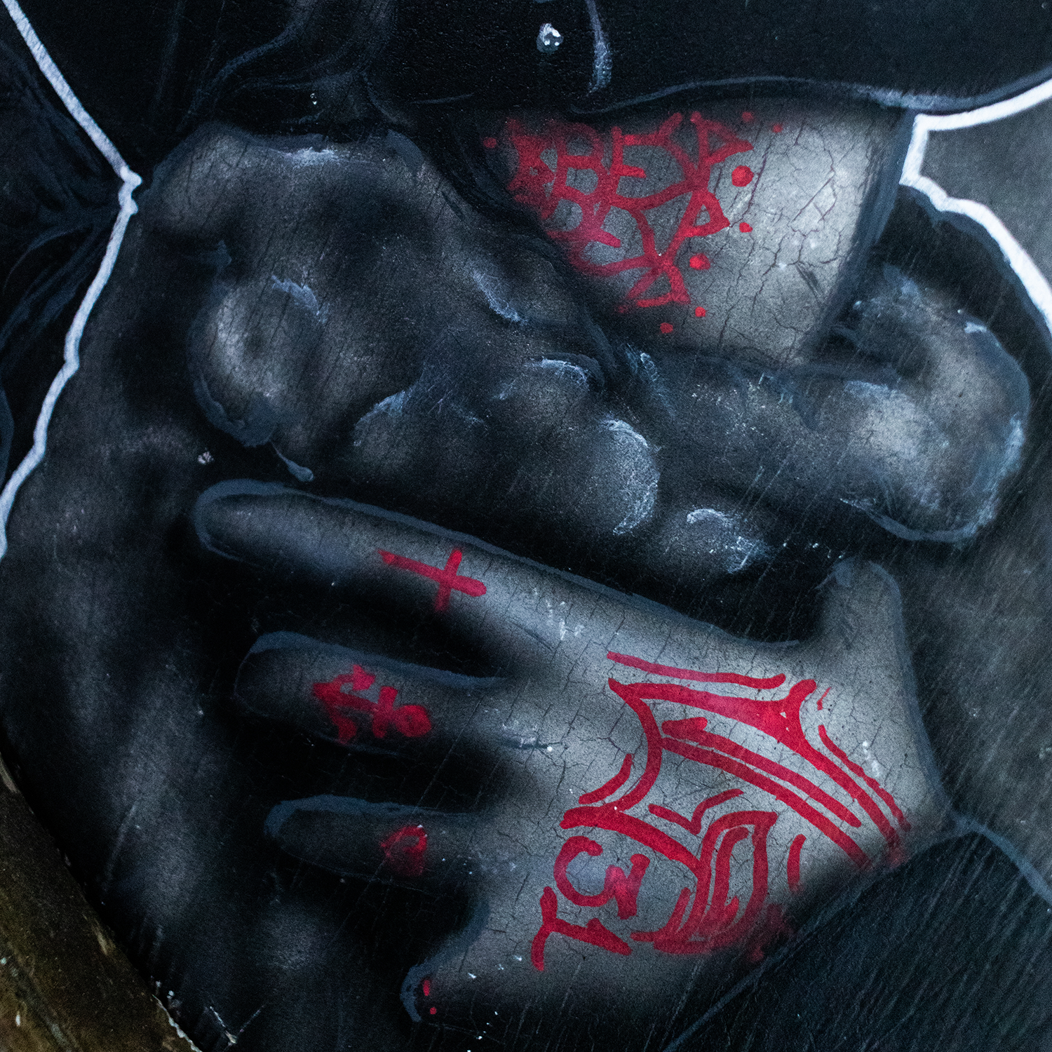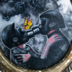 Sob um céu fraturado por relâmpagos e poeira atômica, “O Último Monarca” congela um instante final. Esta não é uma cena de esperança, mas de aceitação; o último ato de amor nos escombros de um mundo desfeito. Duas figuras, seladas em seus trajes de proteção, compartilham um abraço final, enquanto o beijo, impossibilitado pelas máscaras, se torna um símbolo ainda mais poderoso de sua conexão.