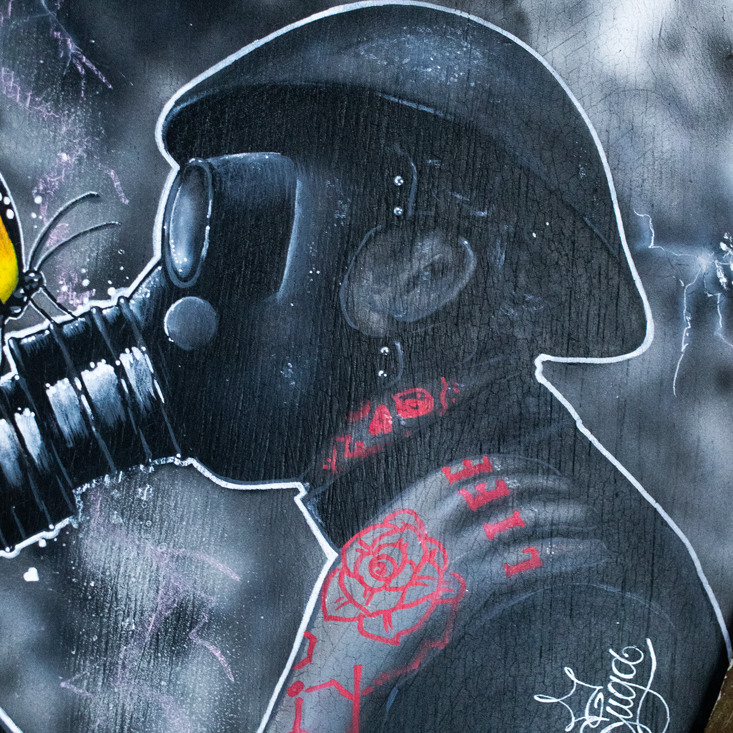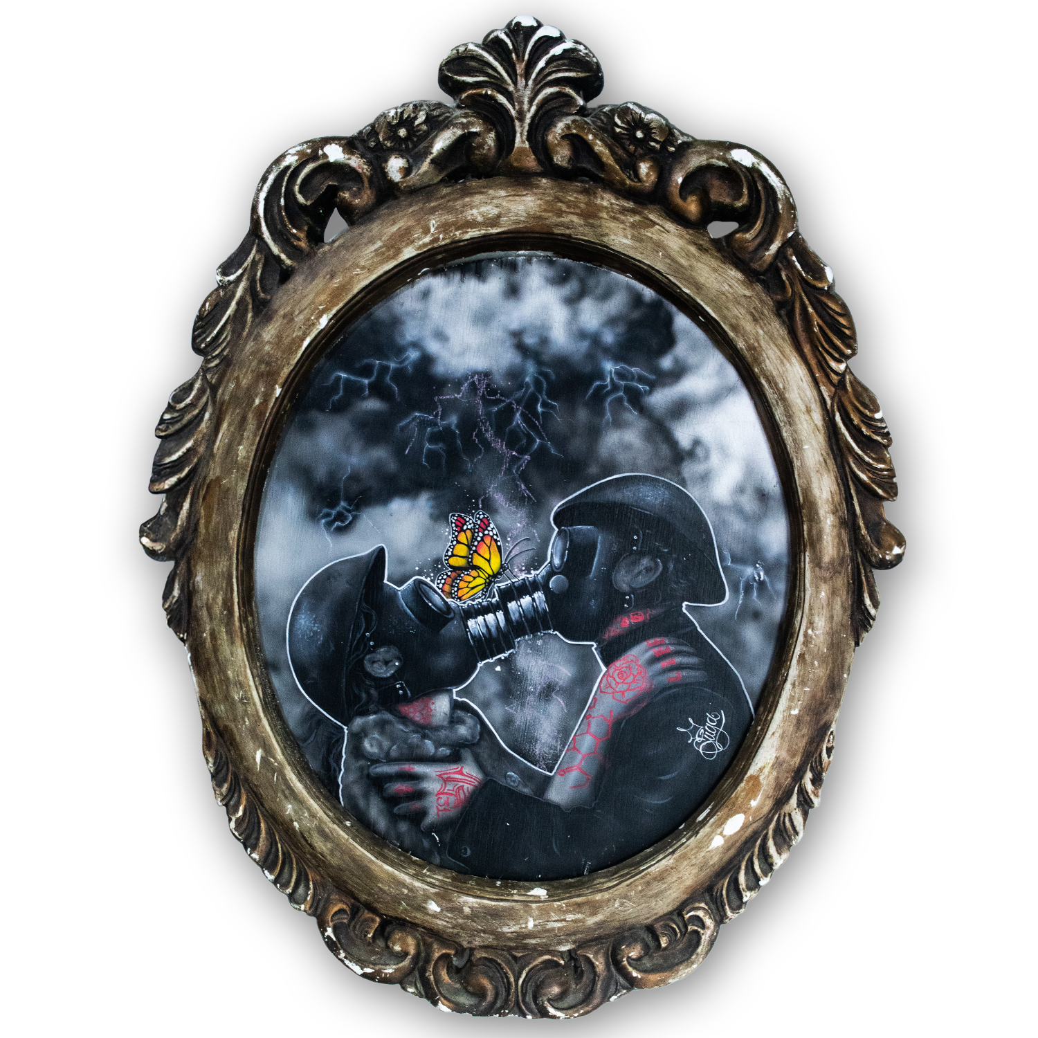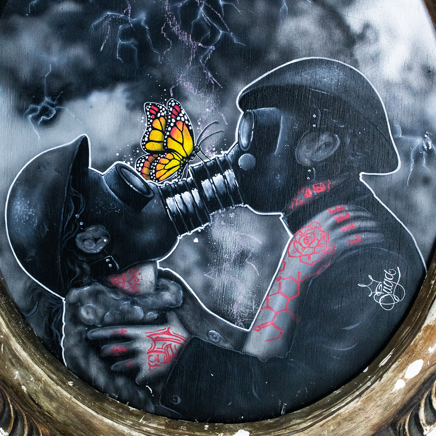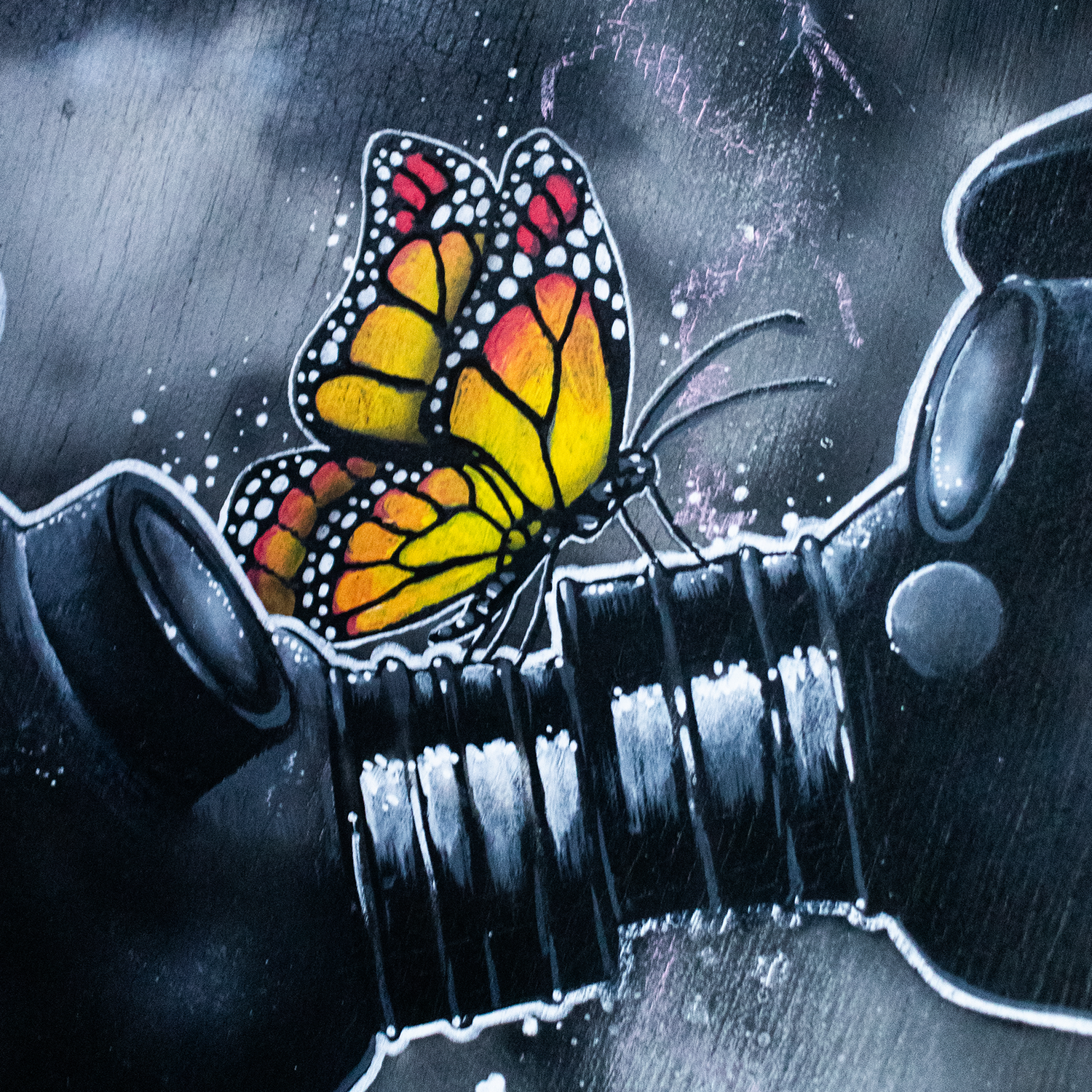 A atmosfera da obra é carregada, construída com um fundo de aerógrafo que simula um céu tóxico e caótico. Os personagens, em silhueta, são definidos por contornos precisos e detalhes de tatuagens em vermelho, como cicatrizes de uma vida anterior. O elemento central, que dá nome à obra, é a borboleta Monarca. Pousada delicadamente no filtro de ar, ela é a testemunha silenciosa deste último suspiro — a beleza improvável no epicentro da aniquilação.