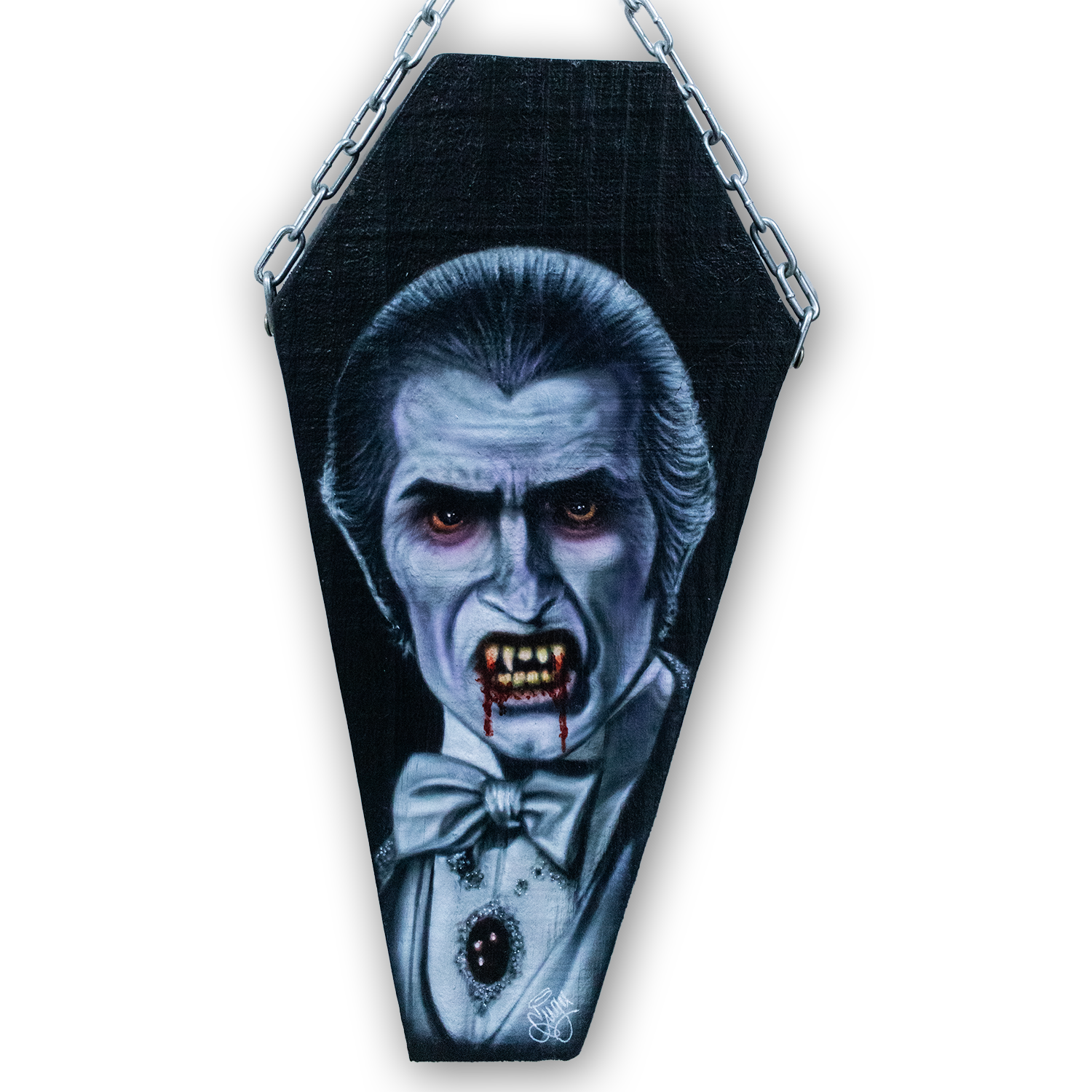 Esta não é uma peça de decoração comum. “Sede Eterna” é uma obra para quem tem apreço pelo icônico e não se contenta com o básico. Um retrato que captura a essência sombria do vampiro clássico, materializado sobre uma base de madeira cortada no inconfundível formato de caixão.